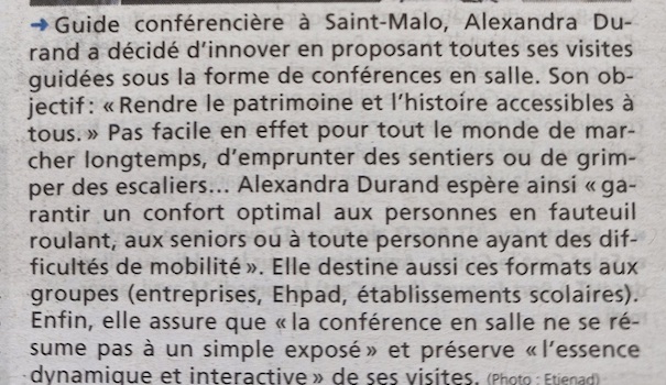 Article du Pays Malouin sur l’adaptation de chacune de mes visites guidées en conférences en salle, pour une meilleure inclusion des personnes à mobilité réduite et pour tout public ne souhaitant pas se déplacer.